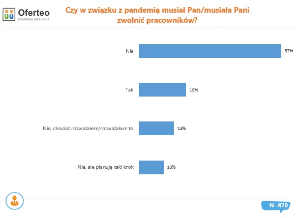 Wyniki badania pokazują, że w 81% przypadków firmom udało się jak dotąd uniknąć zwolnień pracowników. Jednak pracodawcy często rozważali taki krok, a nawet wciąż go planują. Redukcję liczby zatrudnionych przeprowadziło 19% badanych.