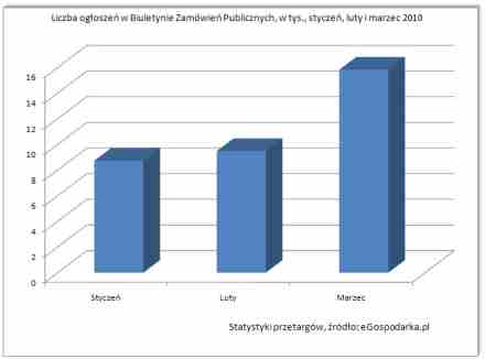 Dane opracowane na podstawie ogłoszeń dostępnych w serwisie www.Przetargi.eGospodarka.pl pochodzących z Biuletynu Zamówień Publicznych, pokazują, że w marcu 2010 roku liczba ogłaszanych zamówień publicznych wzrosła względem poprzedniego miesiąca aż o 66,87 procent. Wzrost ten okazał się dużo wyższy niż w ubiegłych latach, a za jego znaczną skalę odpowiada głównie znaczny przyrost liczby ZP na prace budowlano-remontowe. Sroga i dłuższa niż w poprzednich latach zima odcisnęła wyraźne piętno na pracach budowlanych. Wiosenna poprawa aury pozwoliła jednak na rozpoczęcie remontów oraz budów a także dała nadzieję na odrobienie zaległości i ?nadgonienie” opóźnionych z powodu mrozów i śniegów planów remontowo-budowlanych.